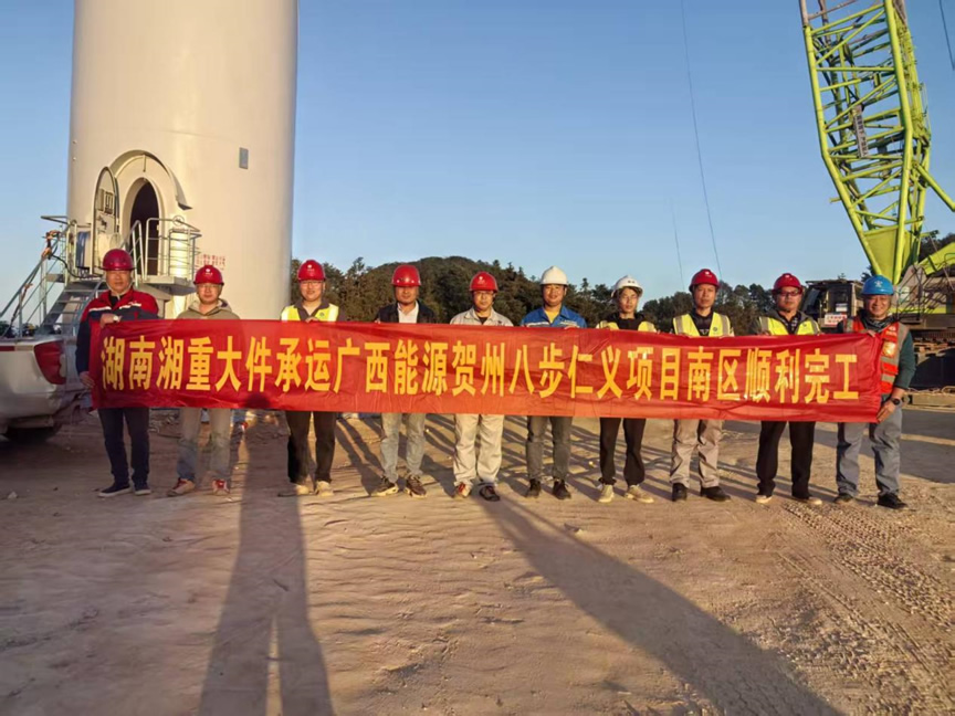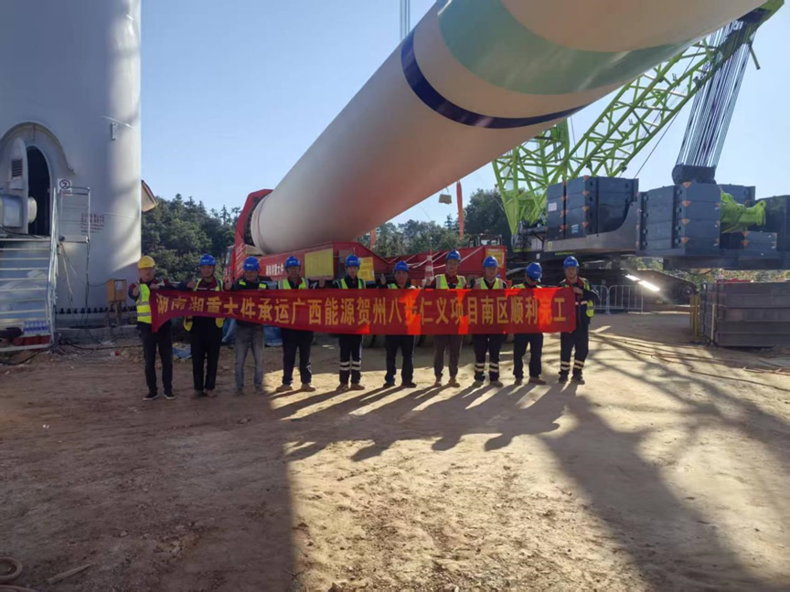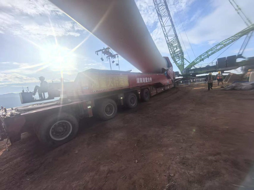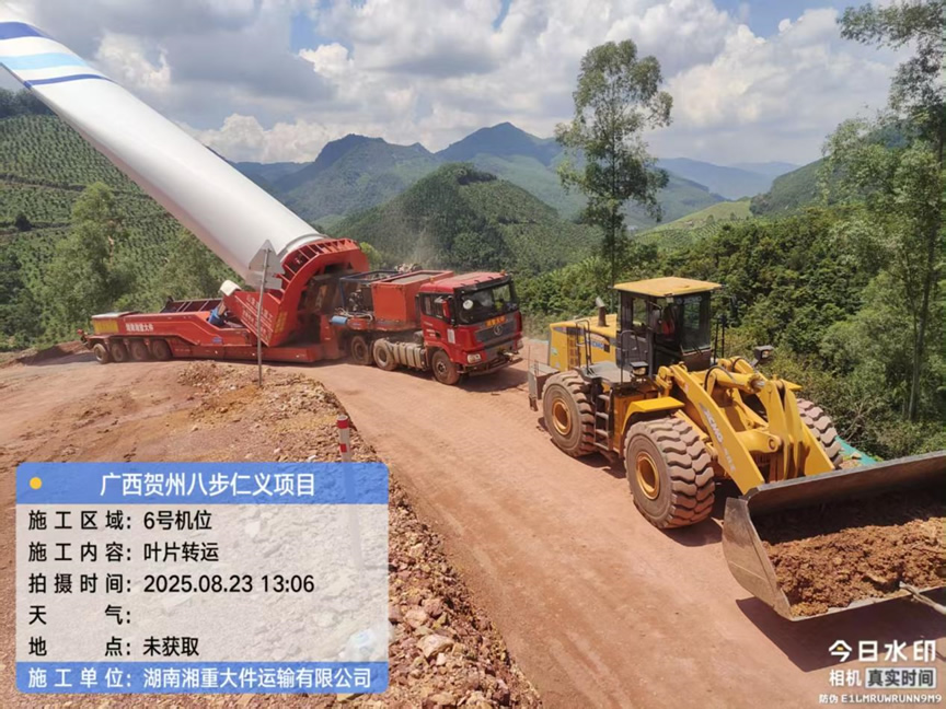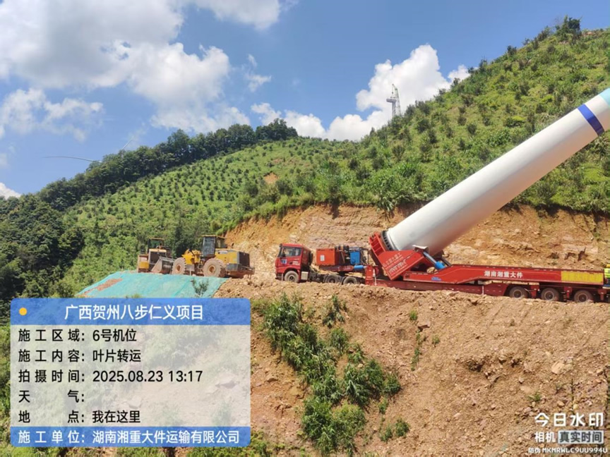 此项目我公司承接的路改分界点为厂家至广西省贺州市八步区信都镇新红村口。其中路改包含收费站改造。我公司承担主机、轮毂及叶片长途运输及二次转运,货物为机位车板交货。此项目运达叶片发货地为河南濮阳、主机轮毂发货地为湖南永州,中车主机、轮毂发运地为广西百色,叶片发货地为湖南株洲,从贺州仁义收费站下高速,下高速后1公里进入项目堆场。堆场至分界点距离为13公里,分界点至机位平均为15公里。目前运达的9套已全部完成。