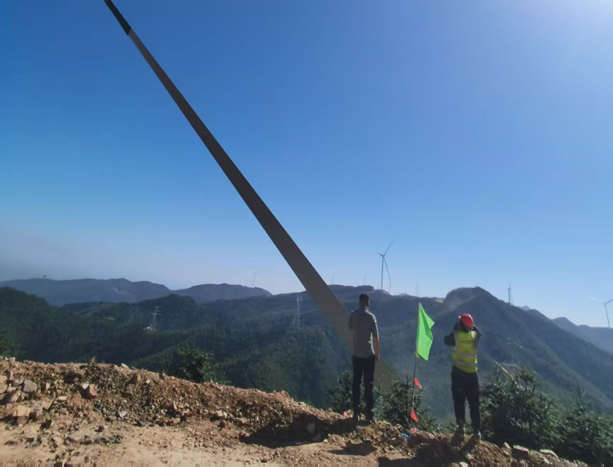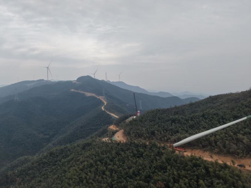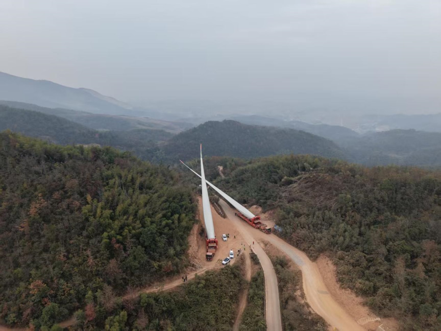 衡阳市祁东县灵官二期风电项目于衡阳市祁东县灵官镇境内。离灵官收费站直线距离约25km。为山地风电项目。风机共计16台,机型为中车6.25MW机型,其中15台叶片长度为108米,1台叶片长度为98米。此项目中我公司承接叶片、机舱及轮毂大件设备运输,货物为机位车板交货。其中上山过程中牵引由总包负责。大件设备从衡永高速灵官收费站下高速,堆场至分界点距离为12公里,分界点至最远机位平均约8.6公里。长途叶片其中15套从广西白色工厂出发经高速运输至堆场,1套叶片及机舱、轮毂、传动链从株洲工厂出发经高速运输至堆场。我司承接上述货物的长途运输及倒运业务。截至2025年12月6日已完成主机运输11台,叶片长途运输9台,叶片倒运8台。预计2026年1月上旬全部完成。
